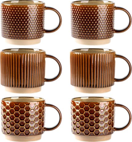 Juego de 6 tazas de café apilables de 12 oz, de cerámica, con patrones texturizados